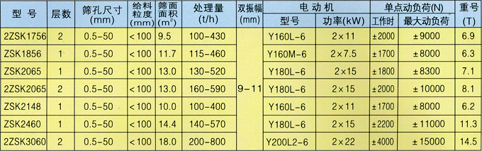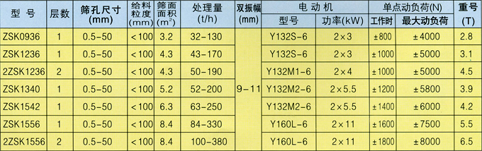 ZSK型振动筛为直线运动,全系列共有二十四种规格,可供选煤、选矿、发电、制糖、制盐等工业部门,对中细粒度物料进行干湿式筛分、脱水、脱介、脱泥。结构先进、坚固耐用、振动噪声小。